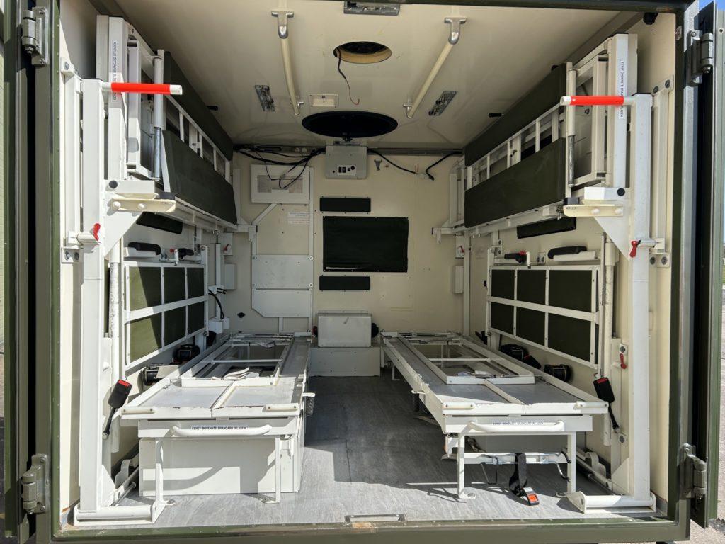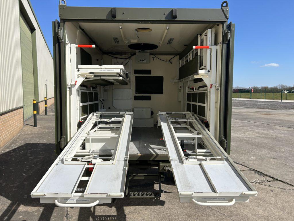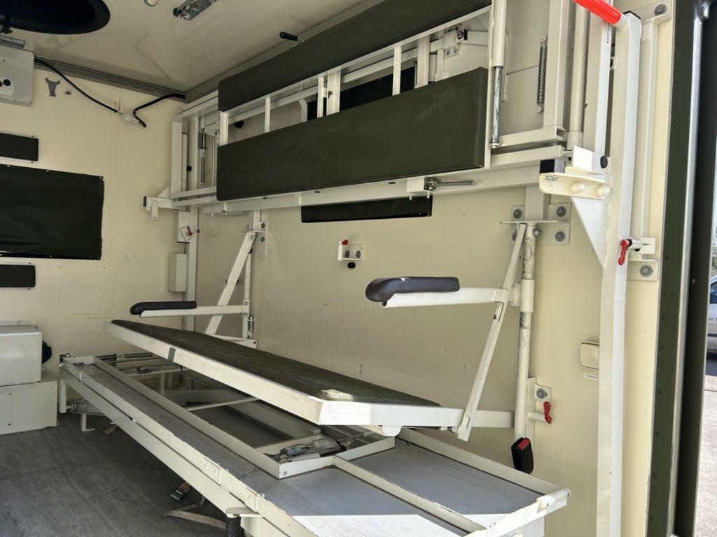 Ambulance body fitted with 4x stretcher racks or racks can be folded up and used for seating for upto 7 persons